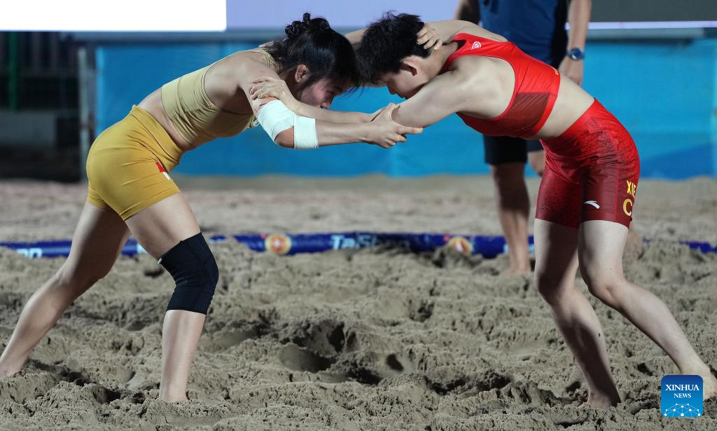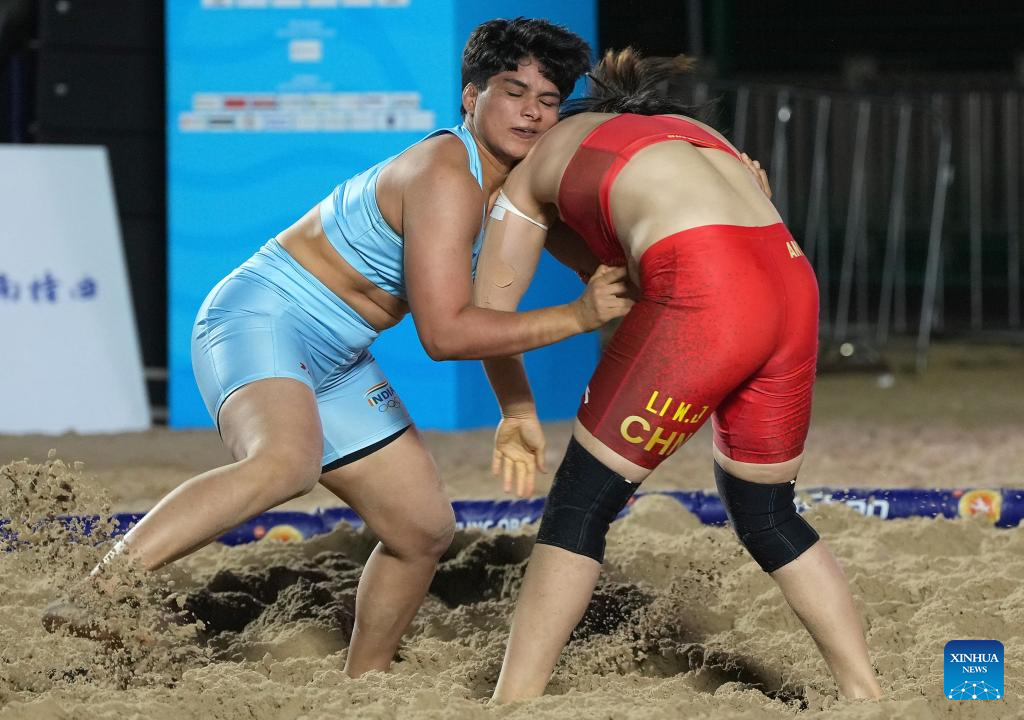 Li Wenji (R) of China competes with Priya of India during their beach wrestling women's +70kg semifinal at the 6th Asian Beach Games in Sanya, south China's Hainan Province, April 28, 2026. (Xinhua/Hu Jingwen)