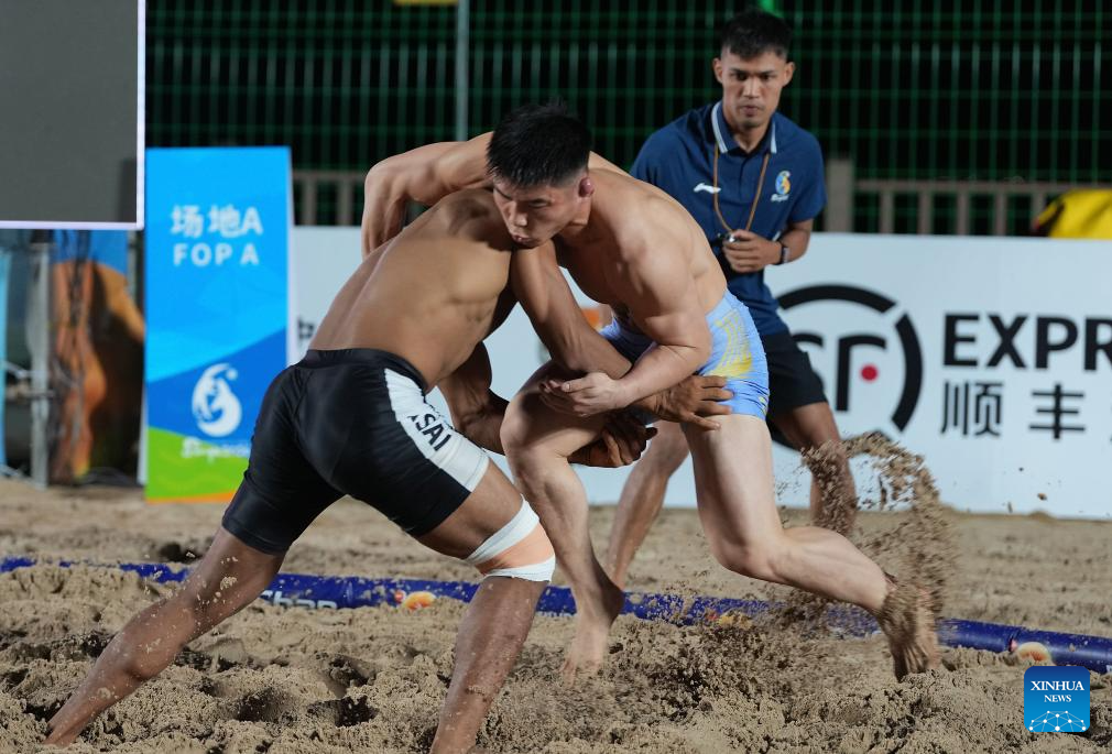 Lu Feng (R) of China competes with Muhammad Asad Ullah of Pakistan during their beach wrestling men's 80kg semifinal at the 6th Asian Beach Games in Sanya, south China's Hainan Province, April 28, 2026. (Xinhua/Hu Jingwen)