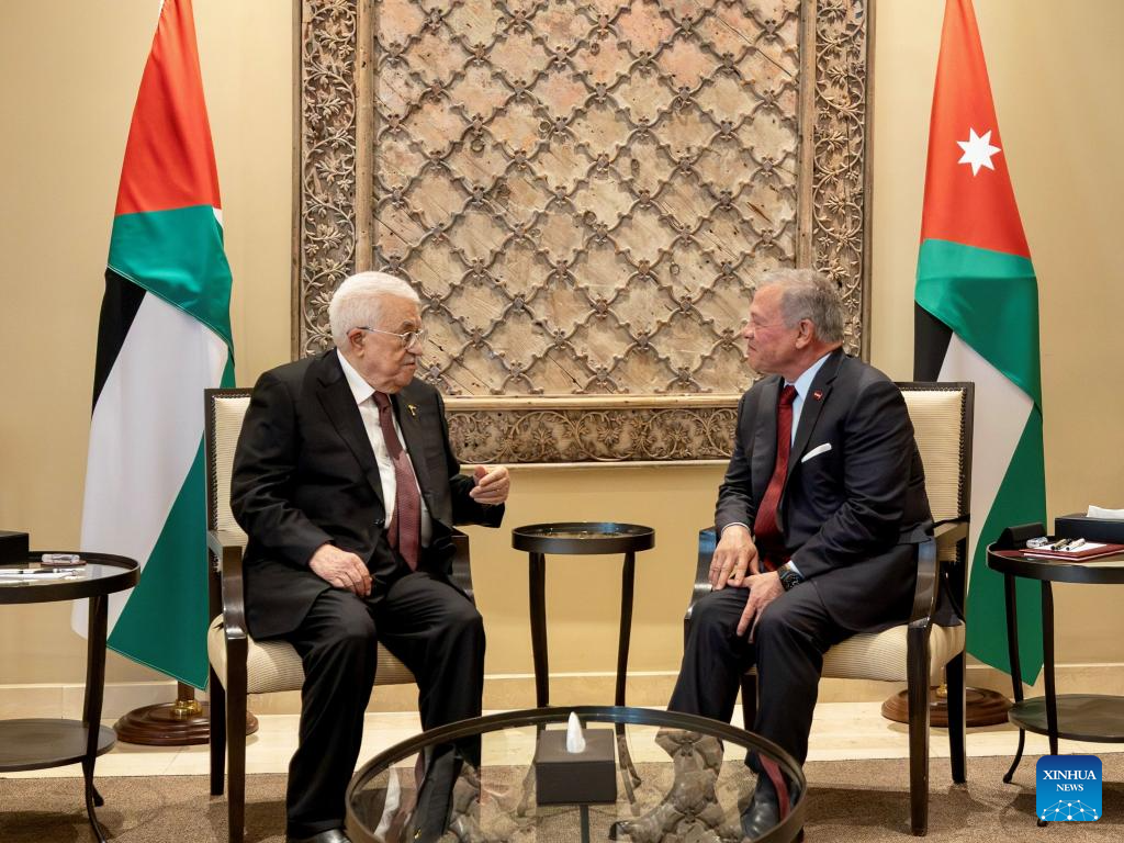 Jordan's King Abdullah II (R) meets with visiting Palestinian President Mahmoud Abbas in Amman, Jordan, April 28, 2026. Jordan's King Abdullah II said Tuesday that regional stability depends on securing Palestinian rights and achieving a two-state solution that would establish an independent Palestinian state, according to a statement from the Royal Court. He made the remarks during a meeting in Amman with Palestinian President Mahmoud Abbas. (Royal Hashemite Court/Handout via Xinhua)
