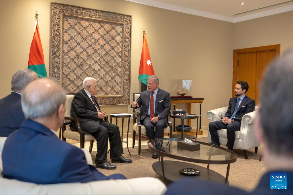 Jordan's King Abdullah II (2nd R) meets with visiting Palestinian President Mahmoud Abbas (3rd L) in Amman, Jordan, April 28, 2026. Jordan's King Abdullah II said Tuesday that regional stability depends on securing Palestinian rights and achieving a two-state solution that would establish an independent Palestinian state, according to a statement from the Royal Court. He made the remarks during a meeting in Amman with Palestinian President Mahmoud Abbas. (Royal Hashemite Court/Handout via Xinhua)