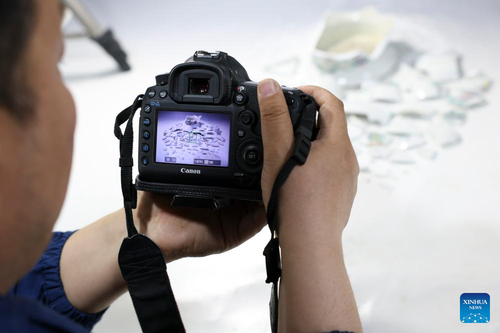 Xu Kai takes a photo of a cultural relic at a studio in Taiyuan, north China's Shanxi Province, April 29, 2026. (Xinhua/Yang Chenguang)