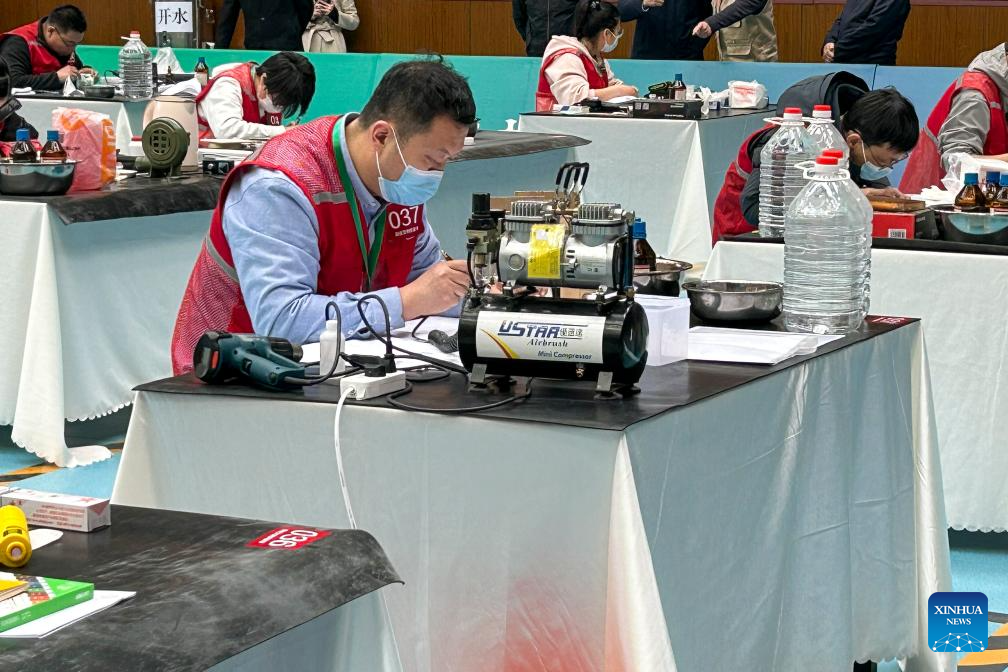 This file photo taken on March 25, 2023 shows Xu Kai participating in the National Cultural Heritage Vocational Skills Competition in Taiyuan, north China's Shanxi Province. (Xinhua/Yang Chenguang)