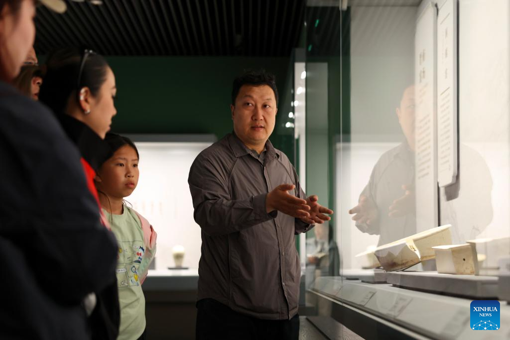 Xu Kai introduces exhibits to visitors at Shanxi Museum in Taiyuan, north China's Shanxi Province, April 29, 2026. (Xinhua/Yang Chenguang)