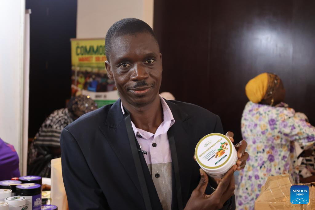 Daniel Kombat, chief executive officer of Danikom Ghana Limited, a producer of natural shea butter and African black soap, poses for photos with shea butter products at an exhibition stand during the Shea 2026 conference in Accra, Ghana, April 28, 2026. Daniel Kombat has said that his company is preparing to capitalize on opportunities in the Chinese market following China's expansion of zero-tariff treatment to all African countries that have diplomatic relations with it, effective May 1.