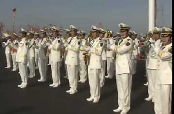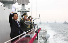 President Hu boards PLA Navy destroyer for fleet parade, review