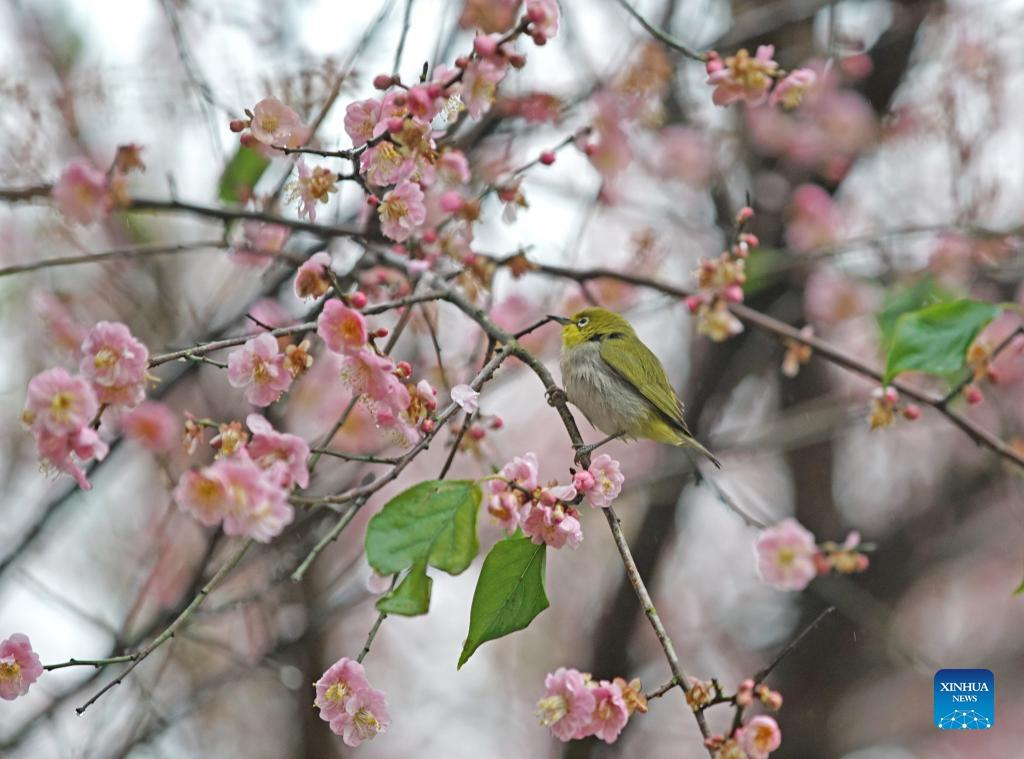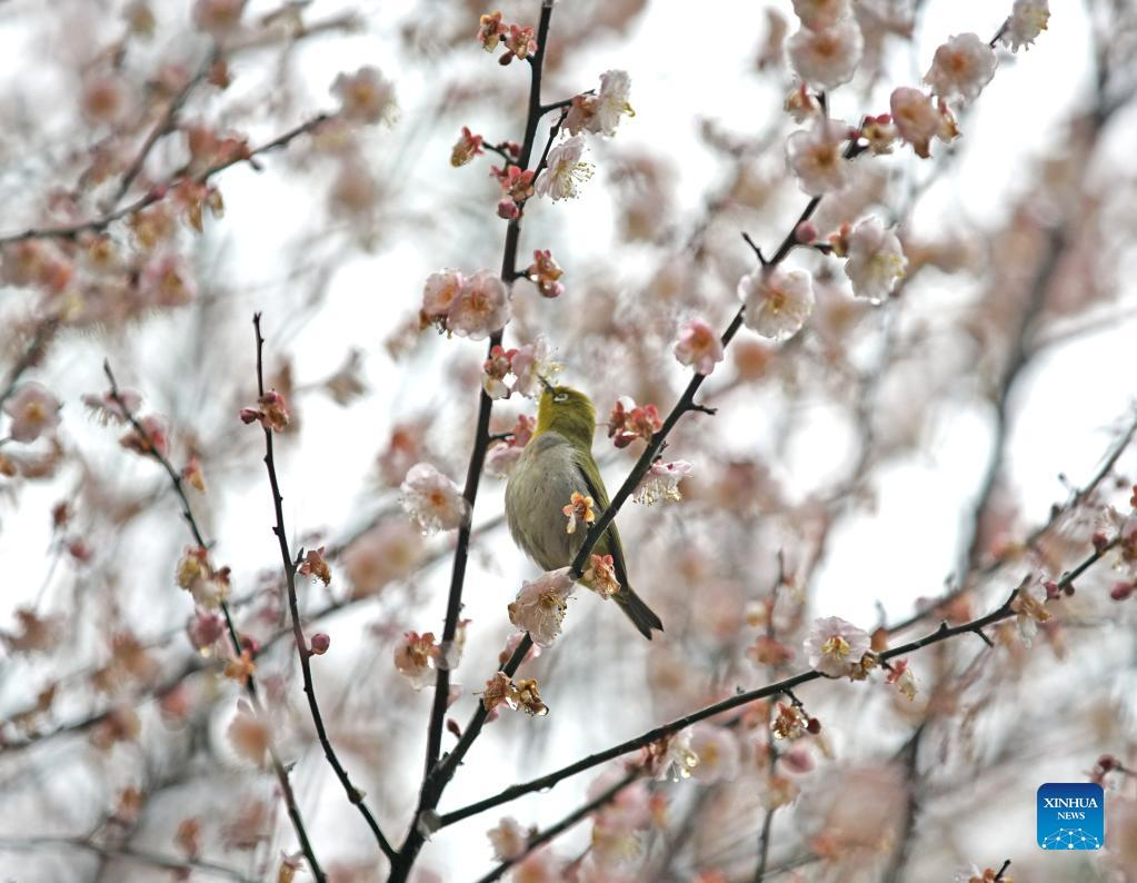 A bird perches on a branch of a plum tree in Qingxiu Mountain scenic area in Nanning, south China's Guangxi Zhuang Autonomous Region, Feb. 13, 2022. The Qingxiu Mountain scenic area has attracted many tourists as plum trees are in blossom in early spring. (Xinhua/Zhou Hua)