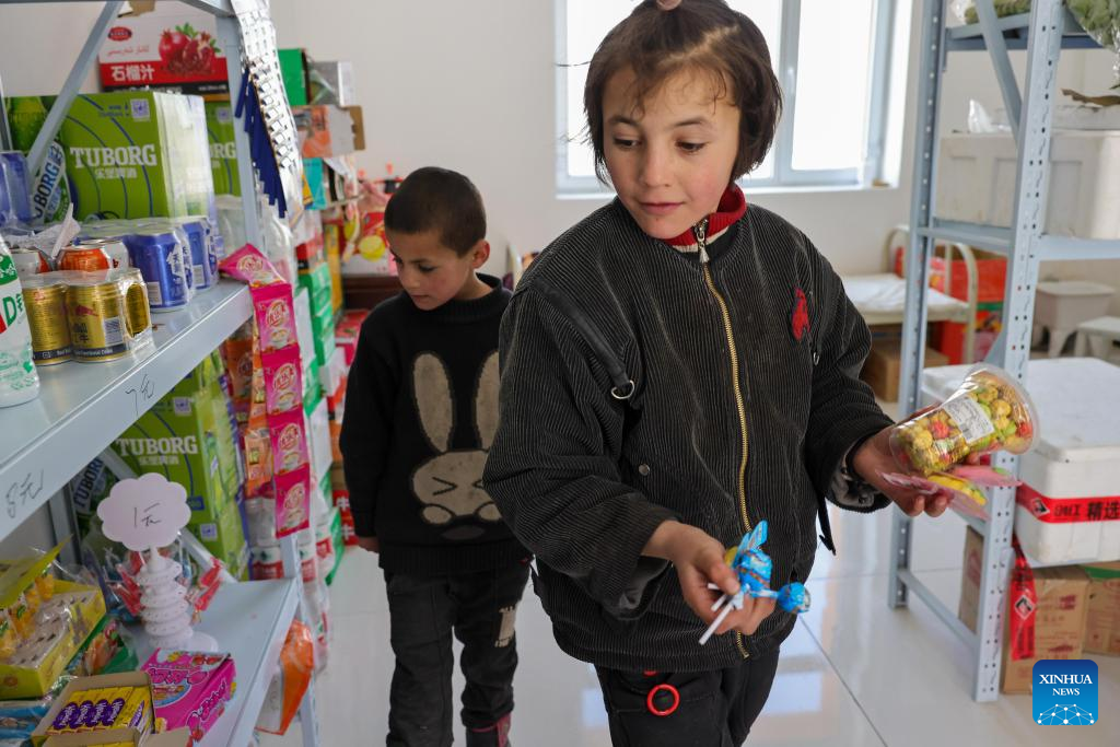 Children buy snacks in a shop in Rasekam Village of Taxkorgan Tajik Autonomous County, northwest China's Xinjiang Uygur Autonomous Region, Feb. 24, 2022.