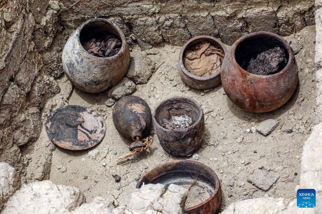 This photo taken on May 27, 2023 shows clay pots used in mummification unearthed at the archaeological site in Saqqara necropolis, south of the capital Cairo, Egypt. Egypt announced on Saturday the discovery of two ancient embalming workshops for humans and animals along with two tombs and a collection of artifacts in Saqqara necropolis, south of the capital Cairo. (Xinhua/Ahmed Gomaa)