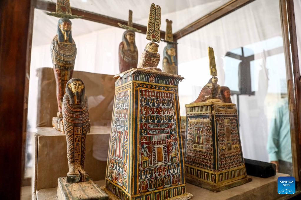 This photo taken on May 27, 2023 shows artifacts exhibited during an archaeological discovery press conference in Saqqara necropolis, south of the capital Cairo, Egypt. Egypt announced on Saturday the discovery of two ancient embalming workshops for humans and animals along with two tombs and a collection of artifacts in Saqqara necropolis, south of the capital Cairo. (Xinhua/Ahmed Gomaa)