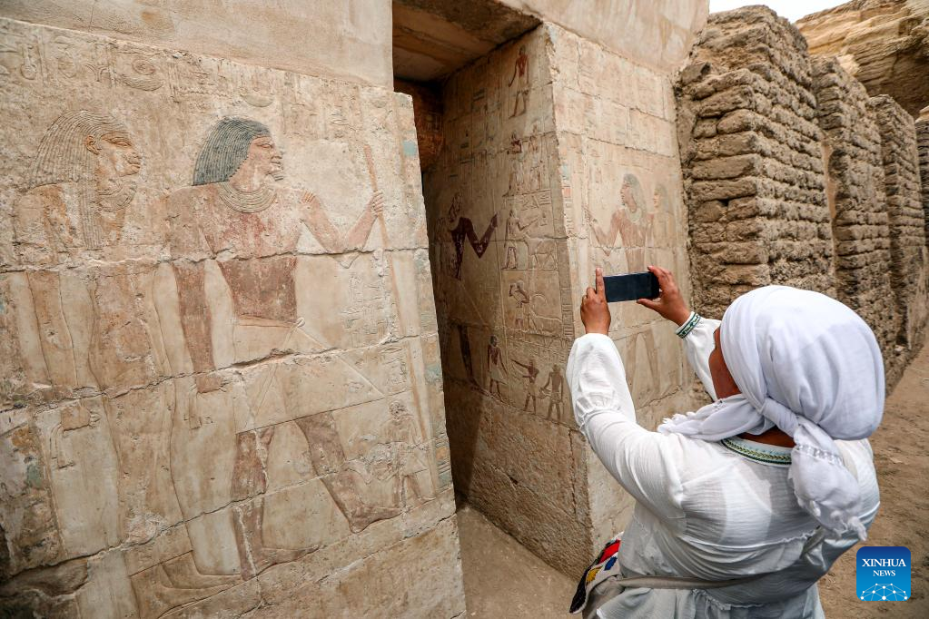 A woman takes photos of an ancient tomb at the archaeological site in Saqqara necropolis, south of the capital Cairo, Egypt, May 27, 2023. Egypt announced on Saturday the discovery of two ancient embalming workshops for humans and animals along with two tombs and a collection of artifacts in Saqqara necropolis, south of the capital Cairo. (Xinhua/Ahmed Gomaa)