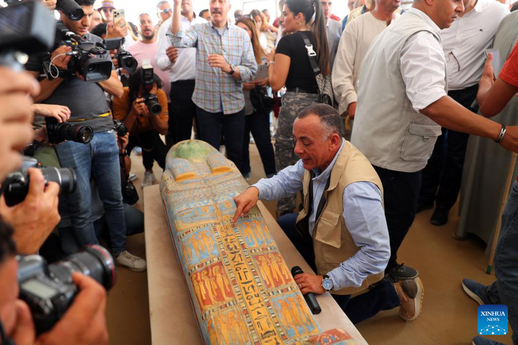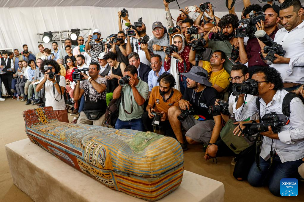 Journalists work in front of a colored mummy coffin exhibited during an archaeological discovery press conference in Saqqara necropolis, south of the capital Cairo, Egypt, May 27, 2023. Egypt announced on Saturday the discovery of two ancient embalming workshops for humans and animals along with two tombs and a collection of artifacts in Saqqara necropolis, south of the capital Cairo. (Xinhua/Ahmed Gomaa)