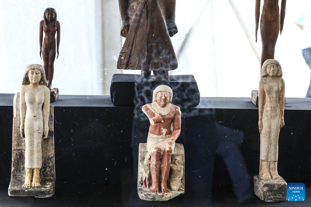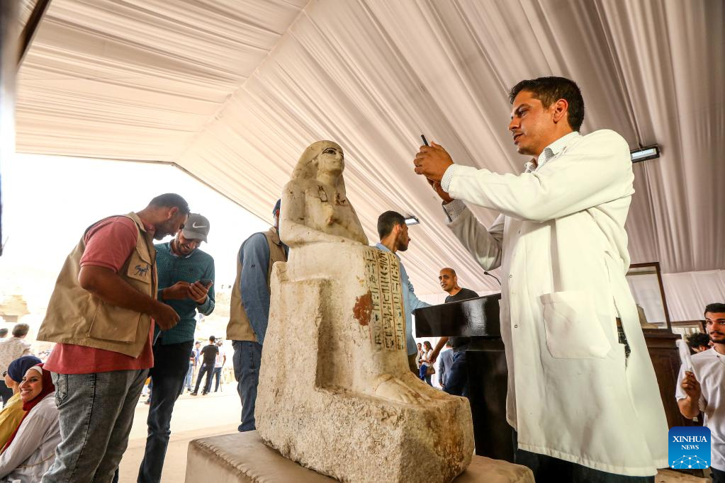 This photo taken on May 27, 2023 shows a statue exhibited during an archaeological discovery press conference in Saqqara necropolis, south of the capital Cairo, Egypt. Egypt announced on Saturday the discovery of two ancient embalming workshops for humans and animals along with two tombs and a collection of artifacts in Saqqara necropolis, south of the capital Cairo. (Xinhua/Ahmed Gomaa)