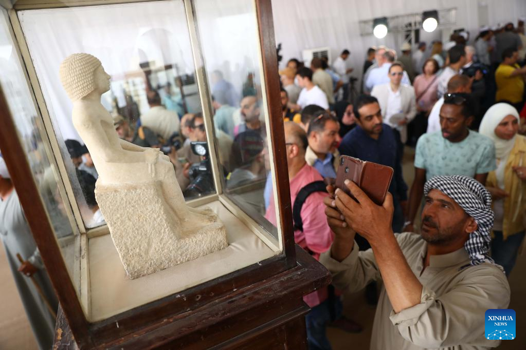 A man takes photos of an artifact exhibited during an archaeological discovery press conference in Saqqara necropolis, south of the capital Cairo, Egypt, May 27, 2023. Egypt announced on Saturday the discovery of two ancient embalming workshops for humans and animals along with two tombs and a collection of artifacts in Saqqara necropolis, south of the capital Cairo. (Xinhua/Ahmed Gomaa)