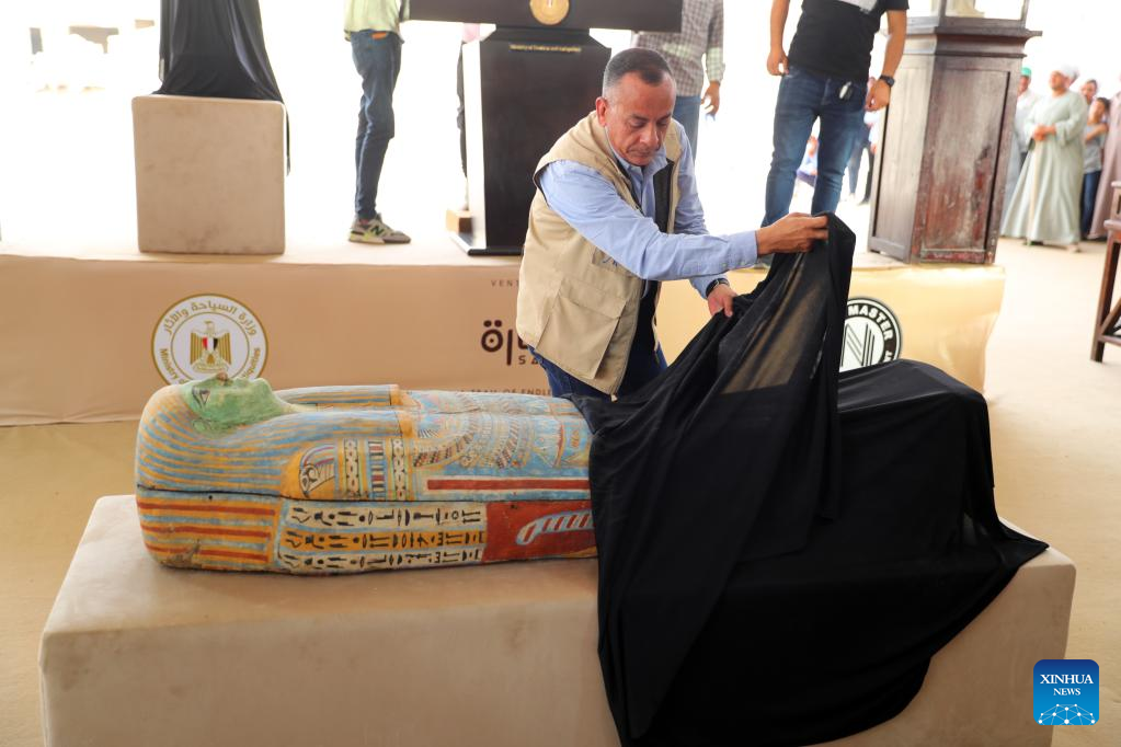Mostafa Waziri, the secretary general of the Supreme Council of Antiquities, unveils a colored mummy coffin during an archaeological discovery press conference in Saqqara necropolis, south of the capital Cairo, Egypt, May 27, 2023. Egypt announced on Saturday the discovery of two ancient embalming workshops for humans and animals along with two tombs and a collection of artifacts in Saqqara necropolis, south of the capital Cairo. (Xinhua/Sui Xiankai)