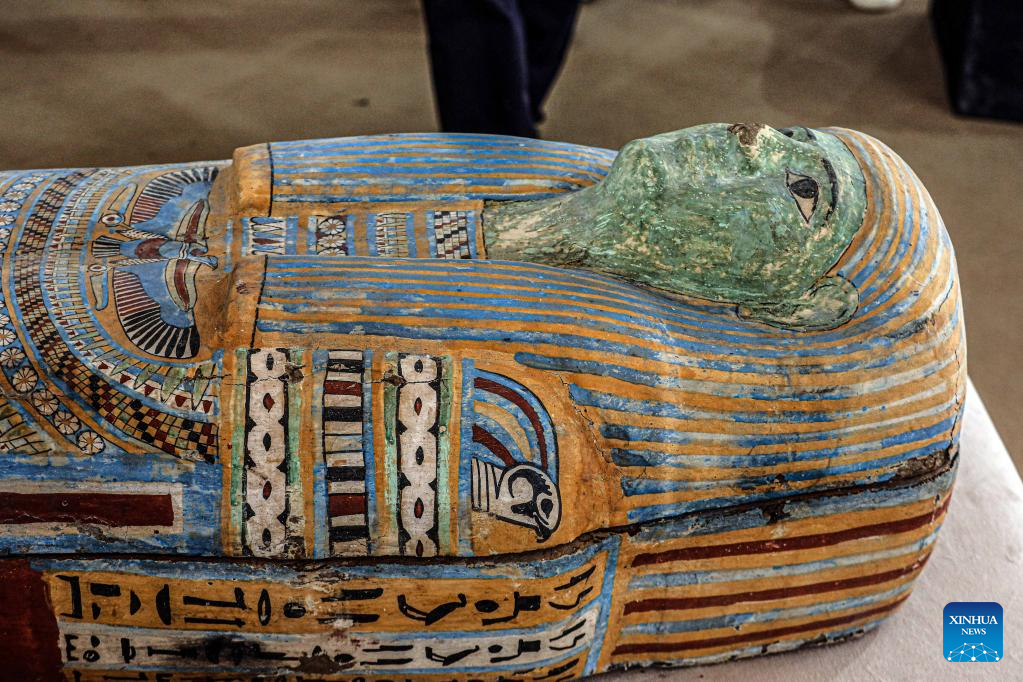 This photo taken on May 27, 2023 shows a colored mummy coffin exhibited during an archaeological discovery press conference in Saqqara necropolis, south of the capital Cairo, Egypt. Egypt announced on Saturday the discovery of two ancient embalming workshops for humans and animals along with two tombs and a collection of artifacts in Saqqara necropolis, south of the capital Cairo. (Xinhua/Ahmed Gomaa)