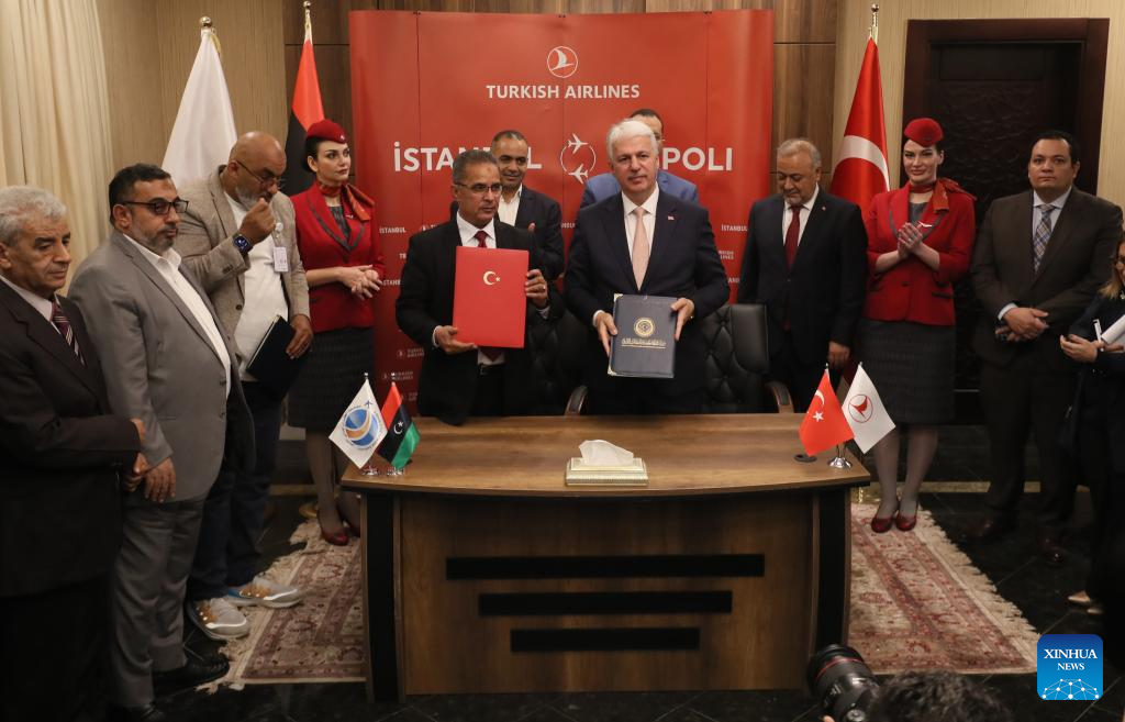 TRIPOLI, March 28 (Xinhua) -- The Turkish Airlines on Thursday resumed commercial flights to the Mitiga International Airport in the Libyan capital Tripoli, after a hiatus of 10 years, Mohamed al-Shohobi, the Libyan minister of transportation, announced in a press conference.