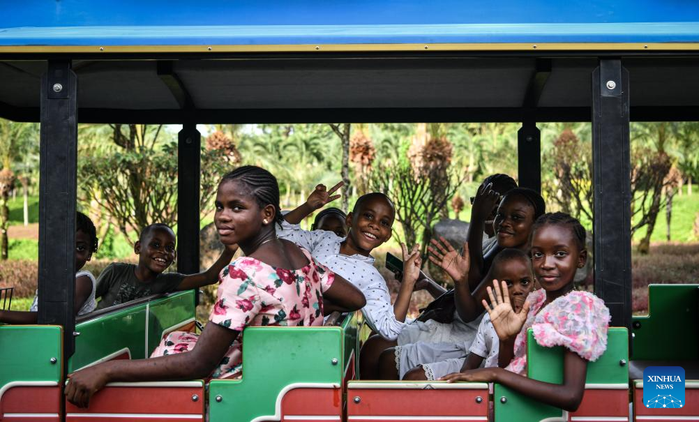Visitors take a sightseeing bus at Malabo National Park in Malabo, the capital of Equatorial Guinea, May 19, 2024. Constructed by the China Road and Bridge Corporation (CRBC), Malabo National Park, one of the largest city parks in Central Africa, was officially put into operation in 2016. The construction of the park has brought numerous job opportunities for local people and enriched the cultural life of Equatorial Guinea. (Xinhua/Han Xu)
