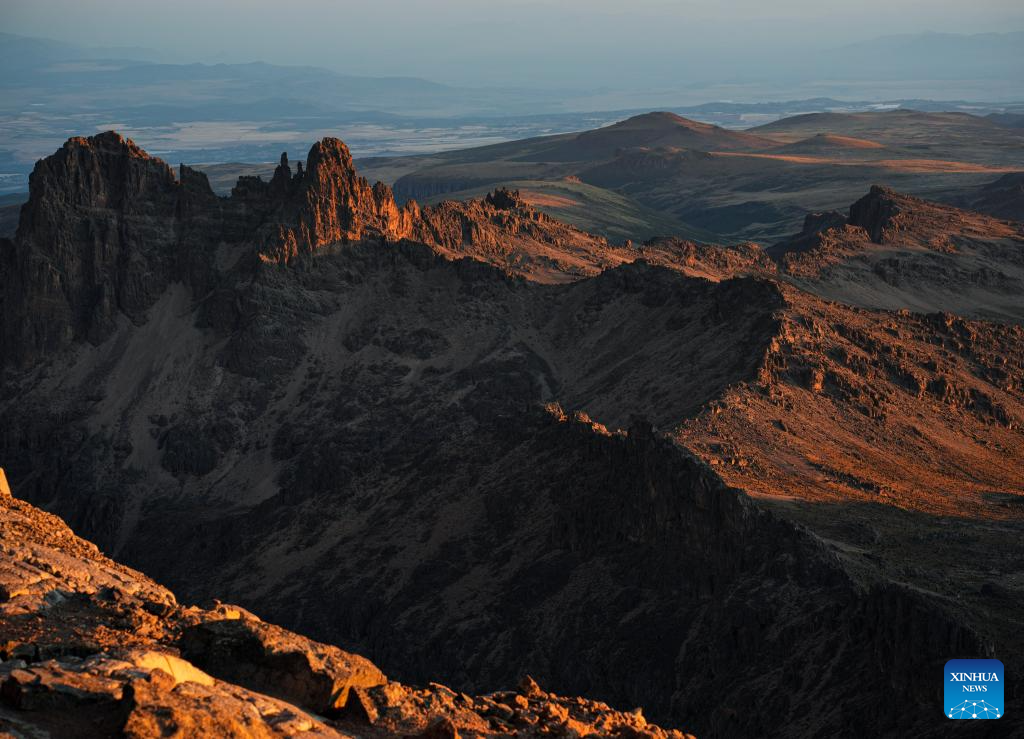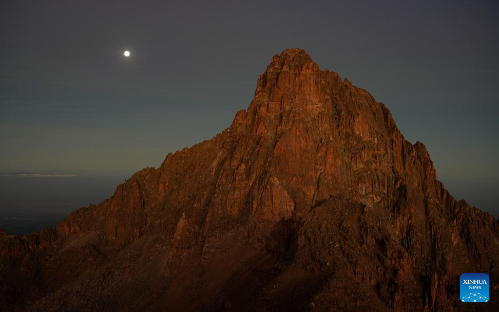 This photo taken on March 15, 2025 shows a dawn view of Mount Kenya, as seen from Point Lenana, the third highest peak of Mount Kenya, at the Mount Kenya National Park in central Kenya. (Xinhua/Li Yahui)