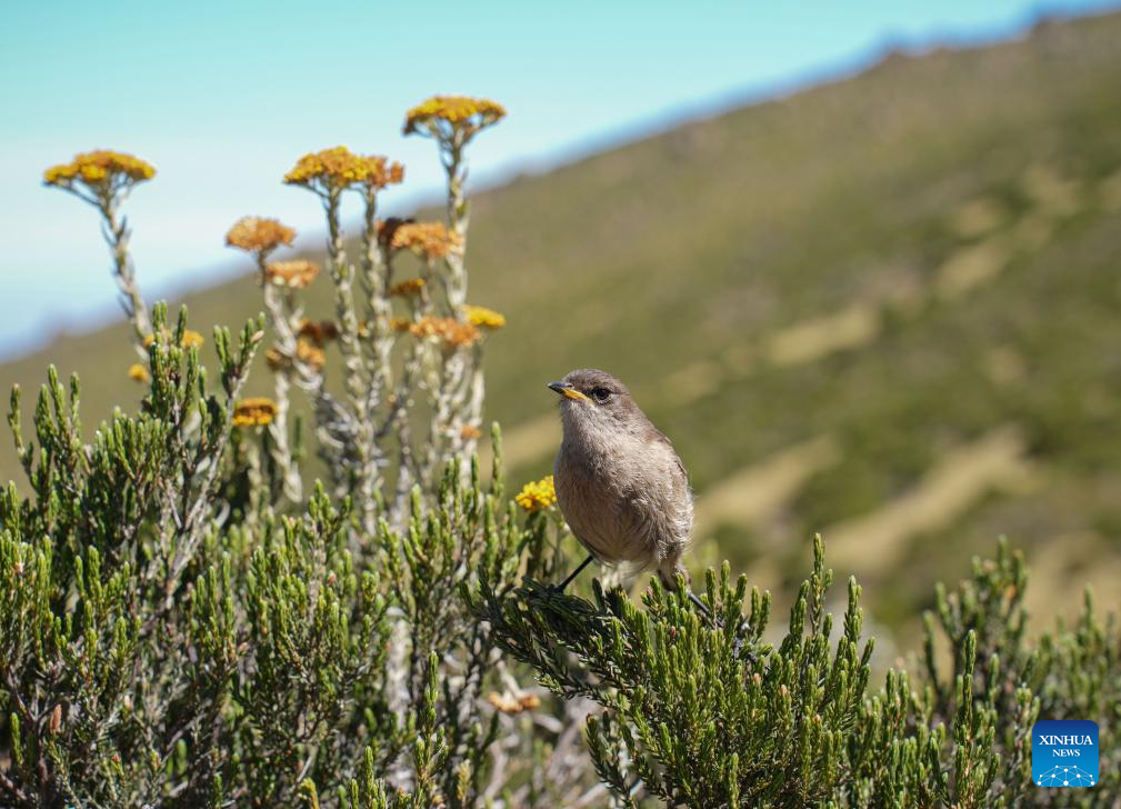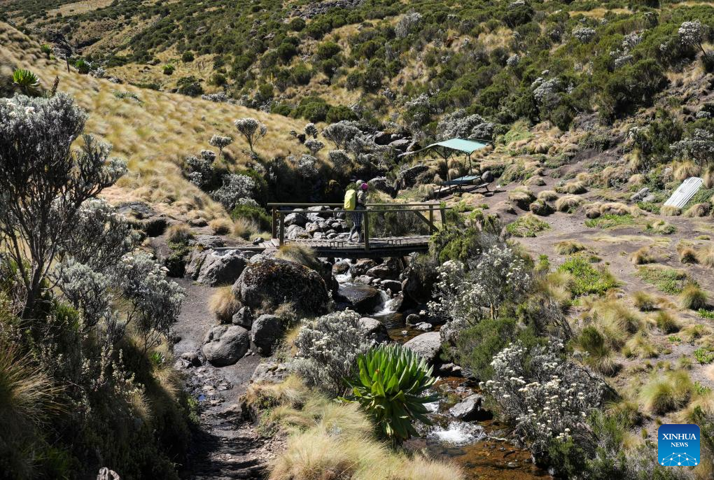 A guide ascends a mountain trail at the Mount Kenya National Park, flanked by Helichrysum plants which are commonly referred to by locals as "everlasting flowers", in central Kenya, March 14, 2025. (Xinhua/Li Yahui)