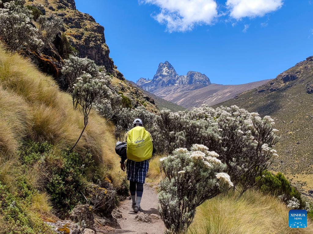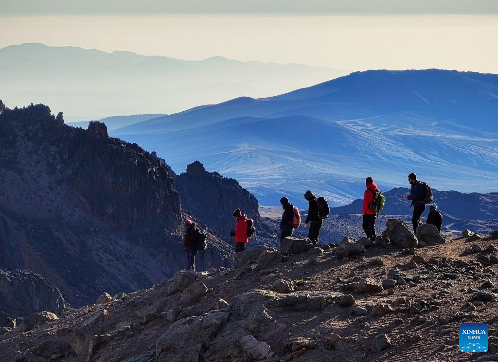 People set off to descend after summiting Point Lenana, the third highest peak of Mount Kenya, at the Mount Kenya National Park in central Kenya, March 15, 2025. (Xinhua/Li Yahui)