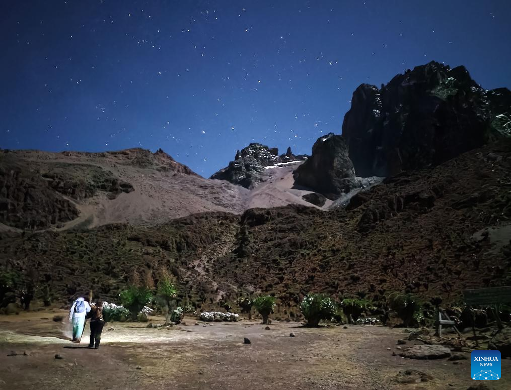 This photo taken with a mobile phone shows a mountaineer, accompanied by a guide, embarking on her summit push of Point Lenana, the third highest peak of Mount Kenya, at the Mount Kenya National Park in central Kenya, March 15, 2025. (Xinhua/Li Yahui)