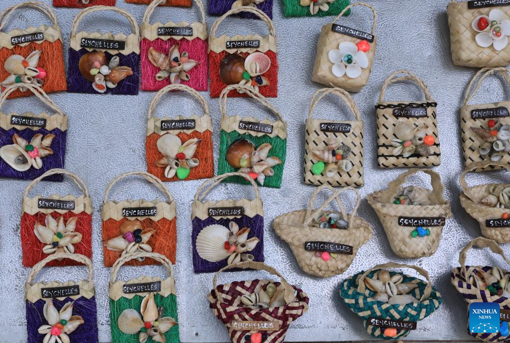 Souvenirs made of natural materials are pictured on La Digue Island in Seychelles, March 15, 2025. Seychelles, an archipelago country in the Indian Ocean, had a land area of about 460 square kilometers and a forest coverage rate of 73 percent in 2020, according to the official website of the United Nations.