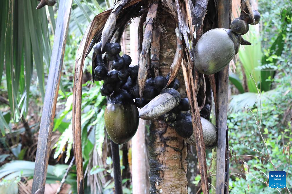 This photo taken on March 15, 2025 shows the fruit of Lodoicea maldivica in the forest of Praslin Island, Seychelles. Seychelles, an archipelago country in the Indian Ocean, had a land area of about 460 square kilometers and a forest coverage rate of 73 percent in 2020, according to the official website of the United Nations.