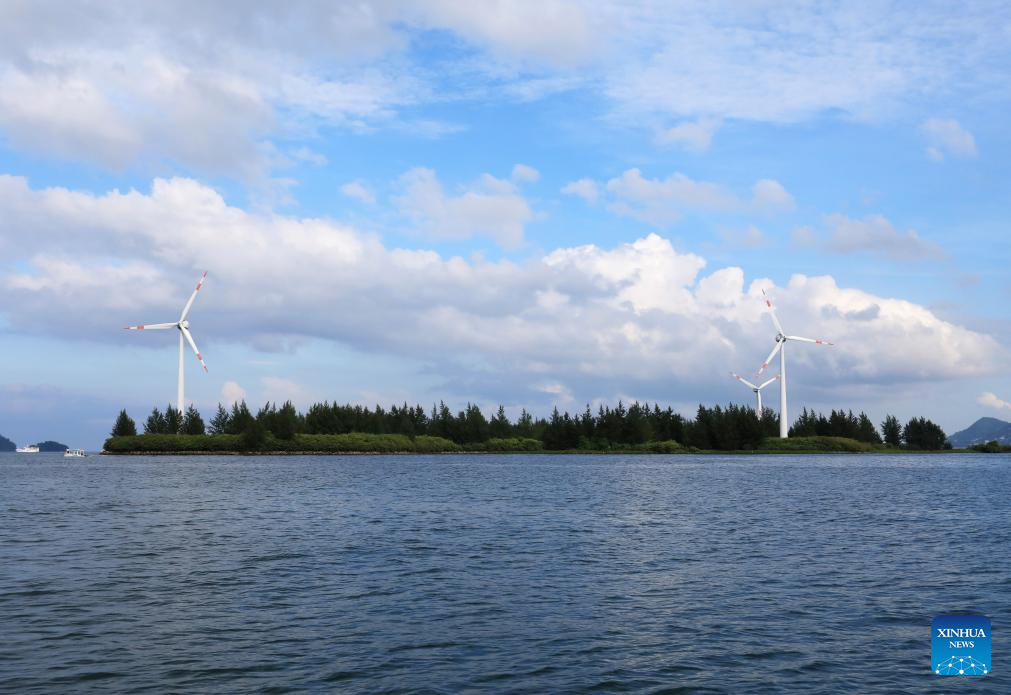 This photo taken on March 15, 2025 shows the forest and wind turbines on a small island in Seychelles. Seychelles, an archipelago country in the Indian Ocean, had a land area of about 460 square kilometers and a forest coverage rate of 73 percent in 2020, according to the official website of the United Nations.