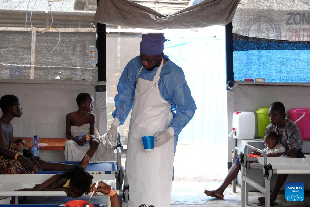 A medical worker takes care of patients at a cholera treatment center in Kinshasa, capital of the Democratic Republic of the Congo, July 10, 2025. The cholera outbreak in the Democratic Republic of the Congo (DRC) has reached an "acute phase," with infections still rising, Health Minister Roger Kamba said Thursday.