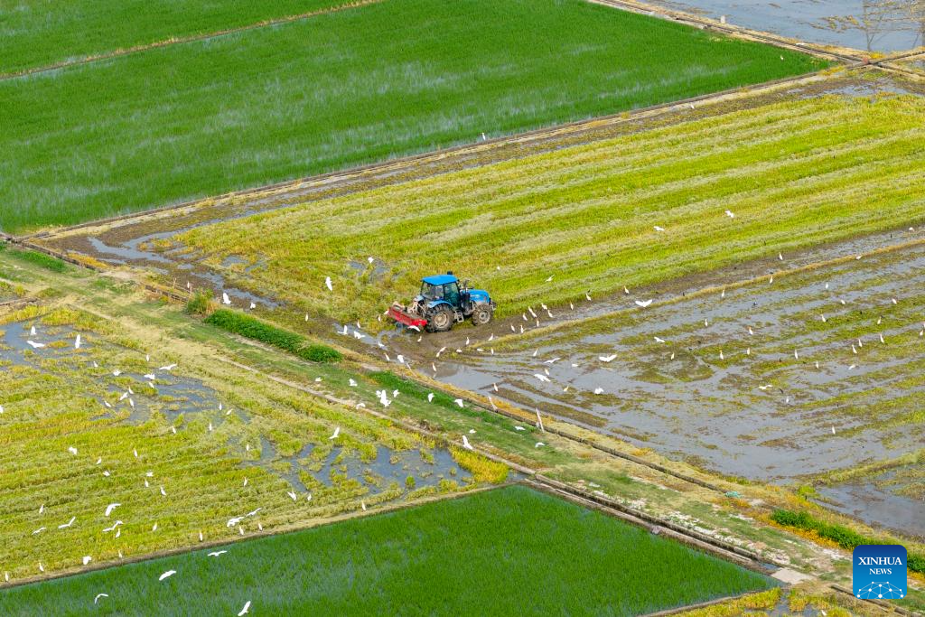 An aerial drone photo taken on July 14, 2025 shows a villager operating machinery to plow the field in Huangjiabu Town of Yuyao City, east China's Zhejiang Province. (Photo by Zhang Hui/Xinhua)