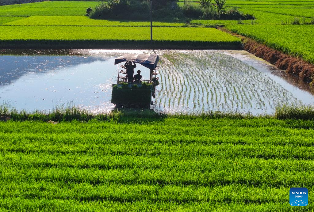 An aerial drone photo taken on July 15, 2025 shows villagers operating a farming machinery transplanting late rice in Hengshan County of Hengyang City, central China's Hunan Province. (Photo by Cao Zhengping/Xinhua)