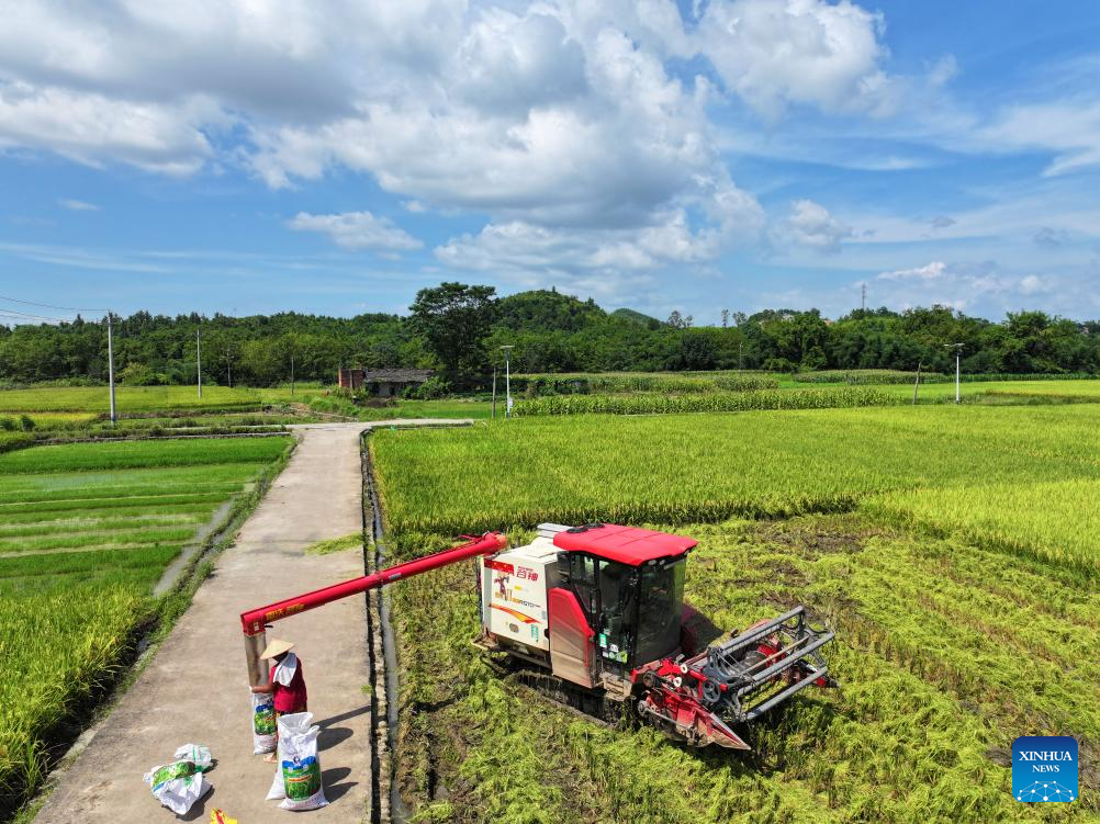 An aerial drone photo taken on July 15, 2025 shows villagers loading harvested rice in a field in Xiage Town of Xianju County, Taizhou City of east China's Zhejiang Province. (Photo by Wang Huabin/Xinhua)