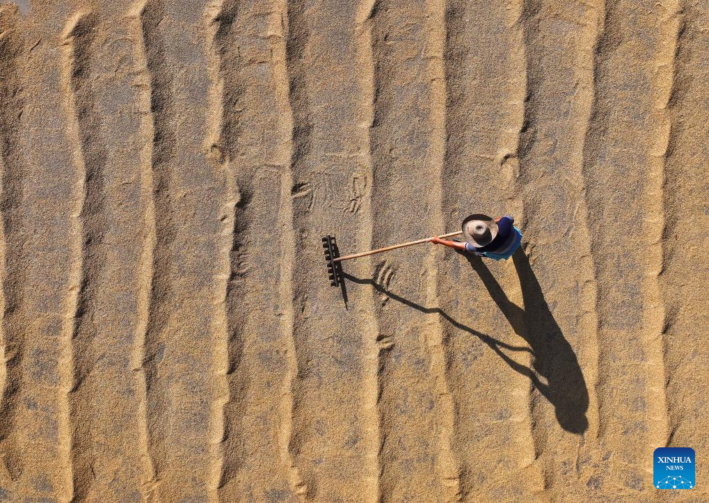 An aerial drone photo taken on July 15, 2025 shows a villager airing rice in Hengshan County of Hengyang City, central China's Hunan Province. (Photo by Cao Zhengping/Xinhua)