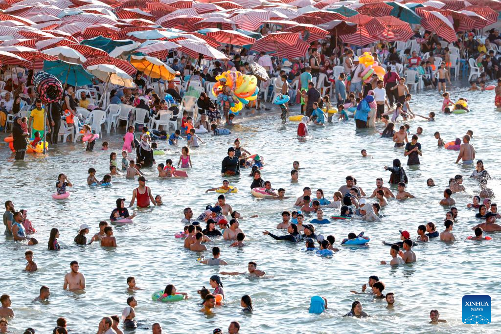 People cool off at a beach of the Mediterranean Sea during a heatwave in Alexandria, Egypt, on July 16, 2025. Egypt is experiencing an exceptional heatwave, with high temperatures and humidity posing significant risks to public health and impacting key sectors such as agriculture and industry. (Xinhua/Ahmed Gomaa)