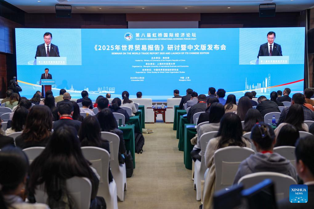 A seminar on World Trade Report 2025 and the launching ceremony of its Chinese edition is held during the 8th Hongqiao International Economic Forum at the National Exhibition and Convention Center (Shanghai) in Shanghai, east China, Nov. 6, 2025. (Xinhua/Wang Zecong)