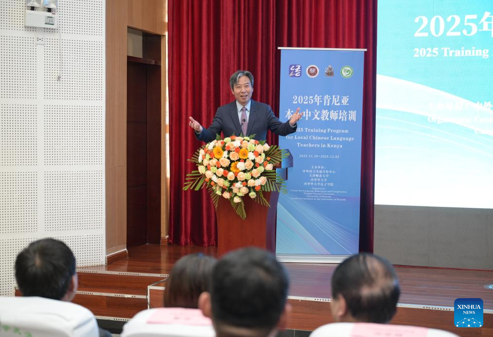 Yu Yunfeng, director-general of the Center for Language Education and Cooperation (CLEC) of China's Ministry of Education, addresses the launching ceremony of a training program for local Chinese language teachers in Nairobi, Kenya, on Nov. 30, 2025. A training program for local Chinese language teachers was launched in Nairobi, the capital of Kenya, on Sunday as part of efforts to promote Sino-Kenyan cultural ties.