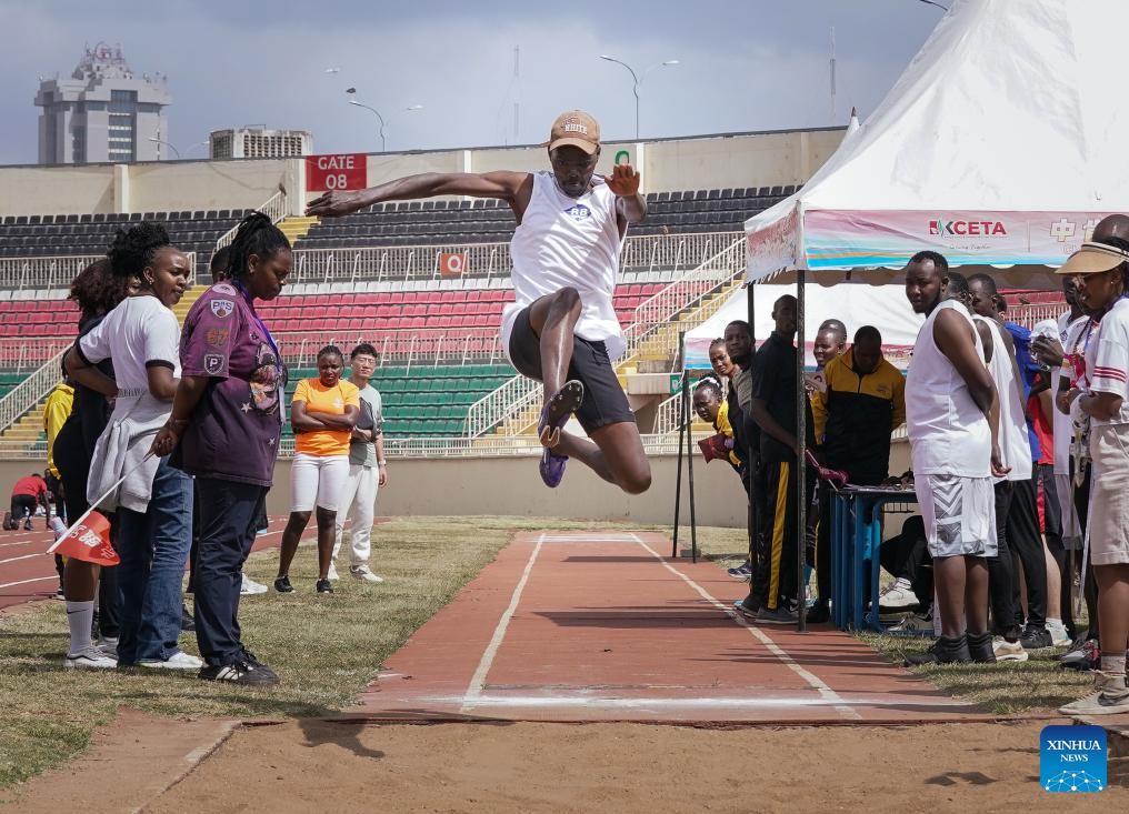 Participants compete in the long jump competition at the China-Kenya Friendship Games in Nairobi, Kenya, on Dec. 4, 2025. The inaugural China-Kenya Friendship Games took place on Thursday in Nairobi, the capital of Kenya, as part of efforts to strengthen bilateral ties. The day-long competition saw over 700 Chinese and Kenyan attendants from 19 Chinese companies who are members of the Kenya-China Economic and Trade Association (KCETA), featuring track and field events, as well as fun games. (Xinhua/Han Xu)