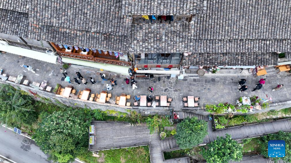 An aerial drone photo taken on Dec. 11, 2025 shows tourists visiting the Gongtan Ancient Town in Youyang Tujia and Miao Autonomous County, southwest China's Chongqing Municipality. (Photo by Qiu Hongbin/Xinhua)