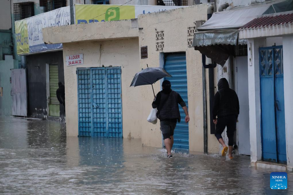 People wade through a flooded road in Tunis, Tunisia, Jan. 20, 2026. At least four people have been killed in Tunisia as the heaviest rainfall since 1950 caused flooding in the country, the state-run Tunis Afrique Presse (TAP) reported Tuesday. (Xinhua/Zhou Haojin)