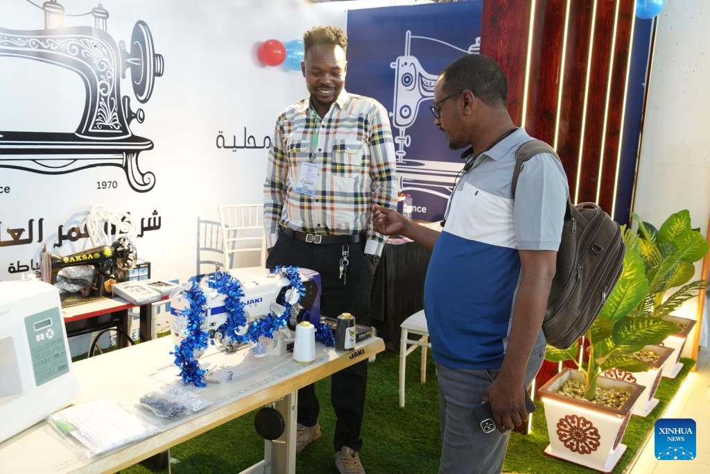 A sewing machine manufacturer introduces products to a visitor at the exhibition in Atbara, River Nile State, Sudan, Jan. 27, 2026. Atbara, a relatively stable city in northern Sudan's River Nile State, is hosting the "Made in River Nile" exhibition, which highlights Sudanese industry's resolve to aid economic recovery and revive national production, even amid the country's ongoing internal conflicts. (Photo by Fayez Elzaki/Xinhua)
