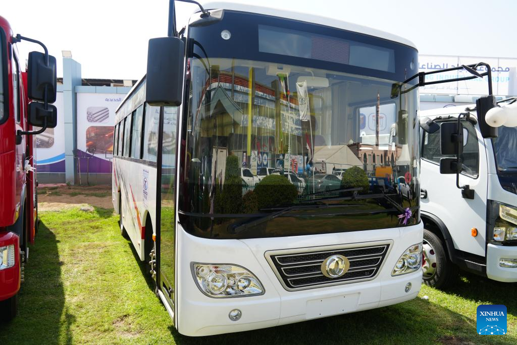 Photo taken on Jan. 27, 2026 shows a Chinese brand passenger bus, produced by GIAD Industrial Group on display at the exhibition in Atbara, River Nile State, Sudan. Atbara, a relatively stable city in northern Sudan's River Nile State, is hosting the "Made in River Nile" exhibition, which highlights Sudanese industry's resolve to aid economic recovery and revive national production, even amid the country's ongoing internal conflicts. (Photo by Fayez Elzaki/Xinhua)