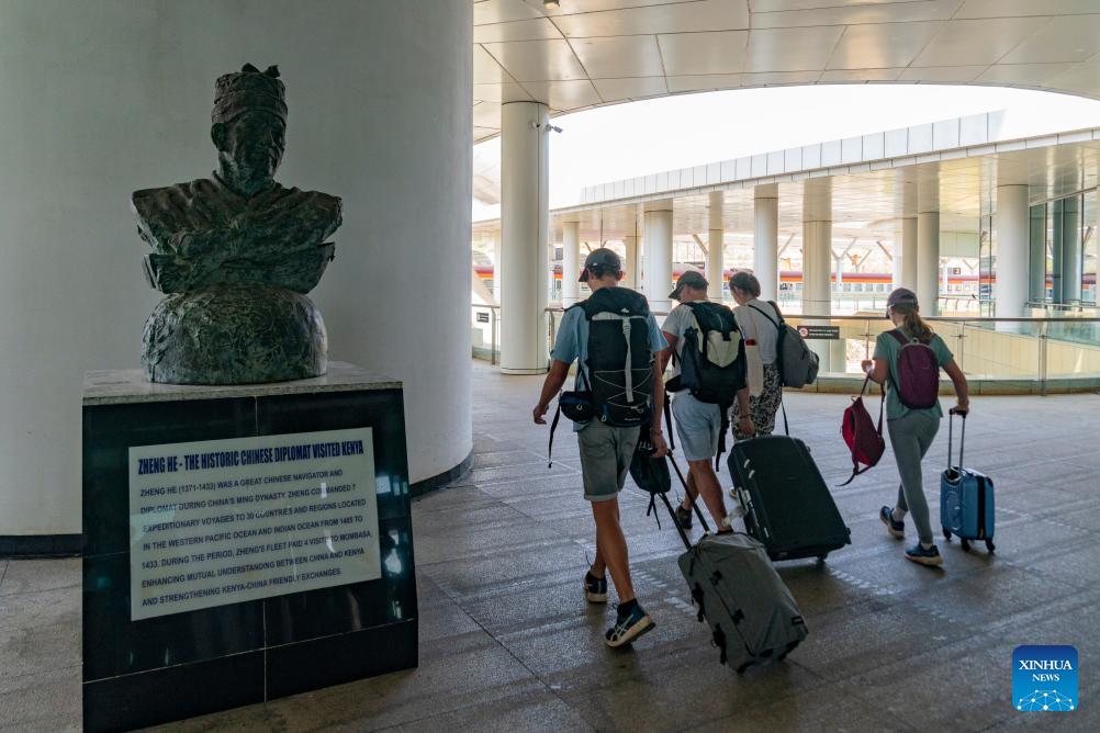 Passengers walk past a statue of Zheng He, a renowned navigator of China's Ming Dynasty (1368-1644) who visited Africa for trade and friendly people-to-people exchanges, at the Mombasa Terminus of the Mombasa-Nairobi railway in Mombasa, Kenya, Feb. 19, 2026. Stretching 472 km from the port city of Mombasa to the capital Nairobi in Kenya, the Chinese-built Mombasa-Nairobi Standard Gauge Railway (SGR) was launched on May 31, 2017. It is the first new railway built in Kenya since independence and a flagship project of China-Kenya cooperation under the Belt and Road Initiative. (Xinhua/Xie Jianfei)
