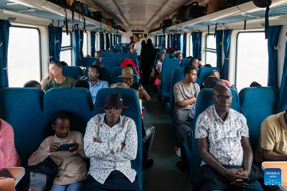 Passengers are pictured aboard a train from Nairobi to Mombasa of the Mombasa-Nairobi railway in Kenya, Feb. 17, 2026. Stretching 472 km from the port city of Mombasa to the capital Nairobi in Kenya, the Chinese-built Mombasa-Nairobi Standard Gauge Railway (SGR) was launched on May 31, 2017. It is the first new railway built in Kenya since independence and a flagship project of China-Kenya cooperation under the Belt and Road Initiative. (Xinhua/Xie Jianfei)