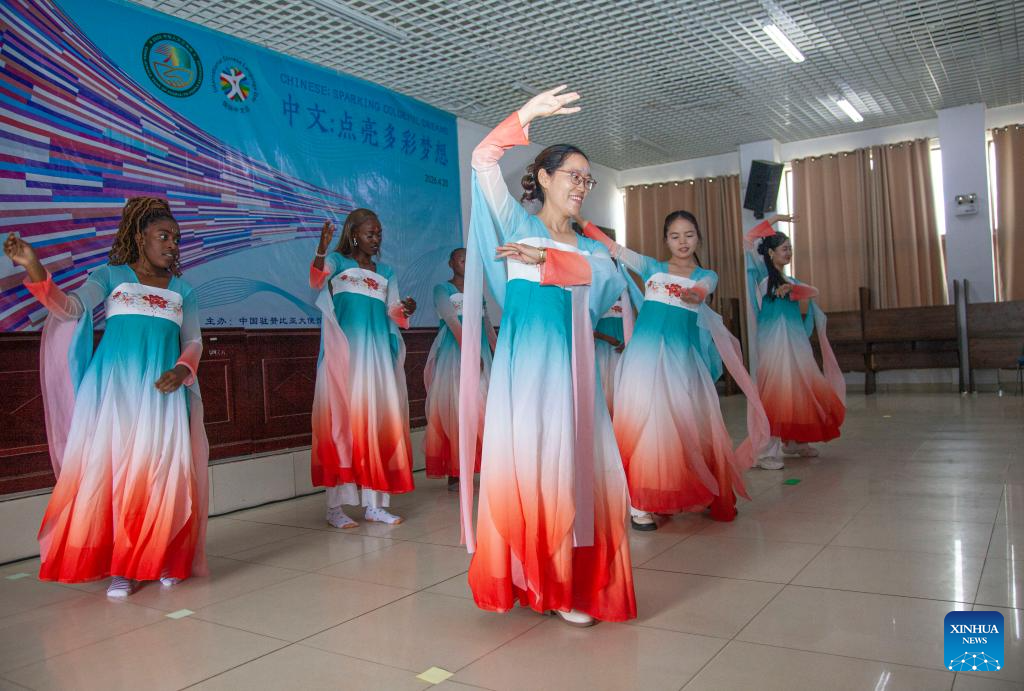 Teachers and students of the Confucius Institute at the University of Zambia perform Chinese dance at an event in celebration of the United Nations (UN) Chinese Language Day on campus in Lusaka, Zambia, April 17, 2026.(Photo by Martin Mbangweta/Xinhua)