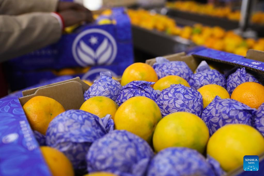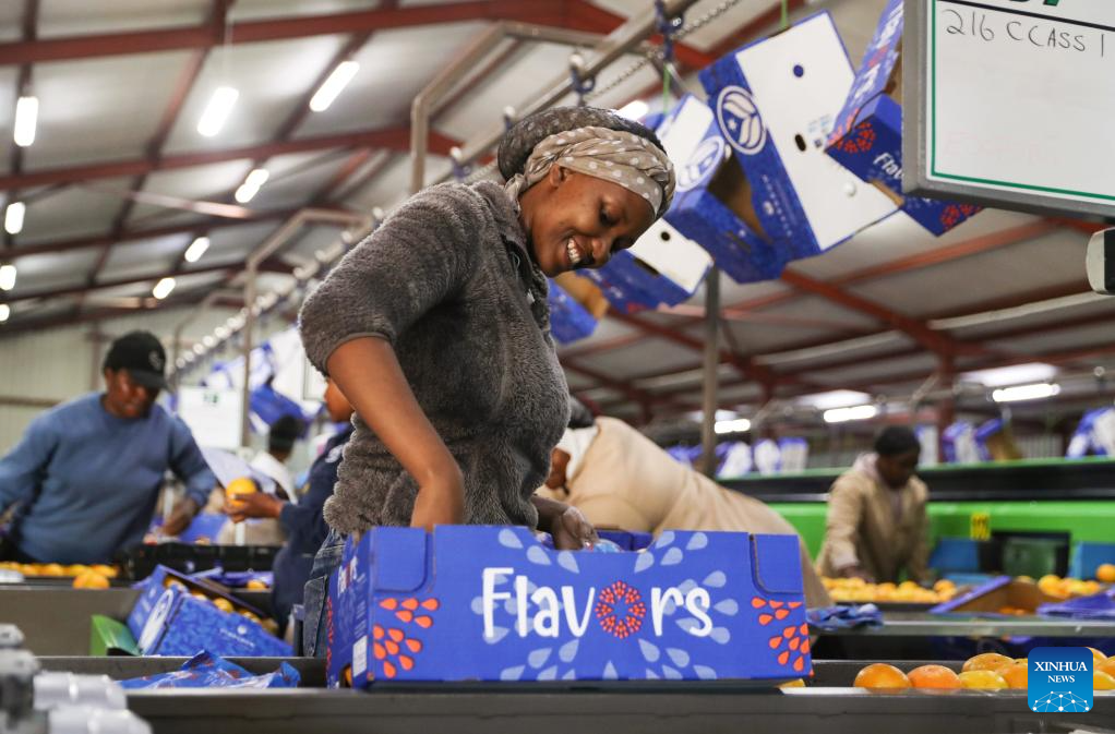 Workers pack citrus at a factory in Brits, North West Province, South Africa, April 28, 2026. The harvest season of citrus in South Africa, a leading exporter of fresh citrus in the world, lasts from February to September. (Xinhua/Chen Wei)
