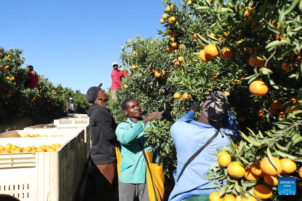 Workers harvest citrus at a farm in Brits, North West Province, South Africa, April 28, 2026. The harvest season of citrus in South Africa, a leading exporter of fresh citrus in the world, lasts from February to September. (Xinhua/Chen Wei)