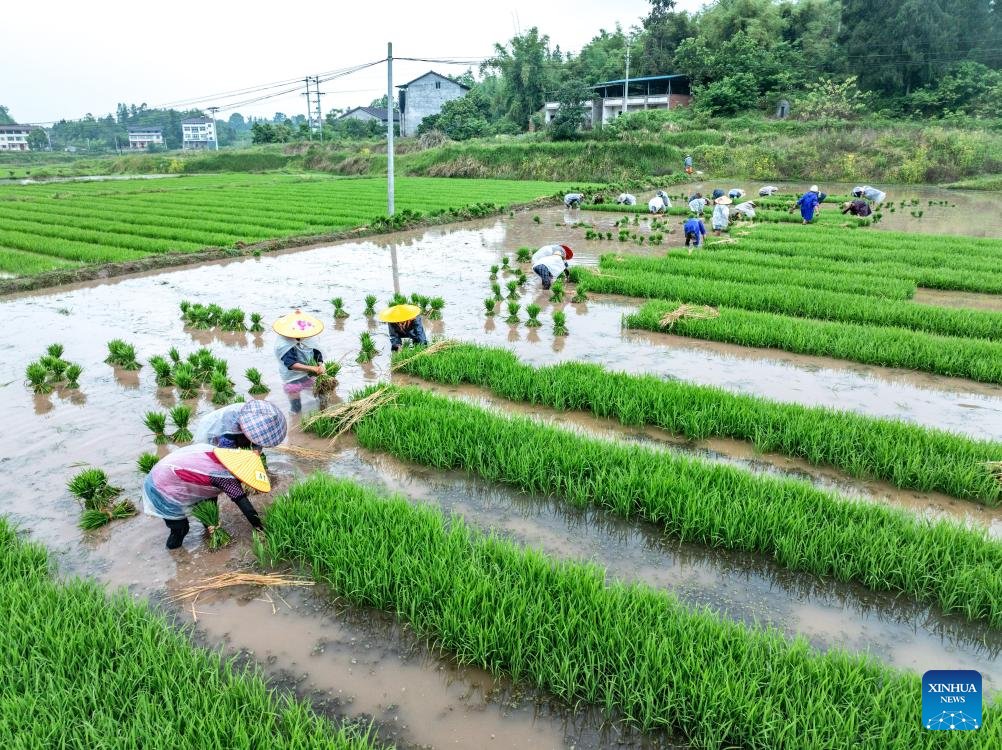 A drone photo taken on April 26, 2026 shows farmers working in a paddy field in Yueguang Village of Baishi Town, Guang'an City of southwest China's Sichuan Province. (Photo by Zhang Guosheng/Xinhua)