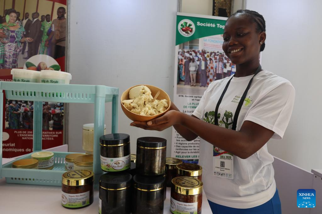 An exhibitor displays shea products at the Shea 2026 conference in Accra, Ghana, April 28, 2026. (Photo by Seth/Xinhua)