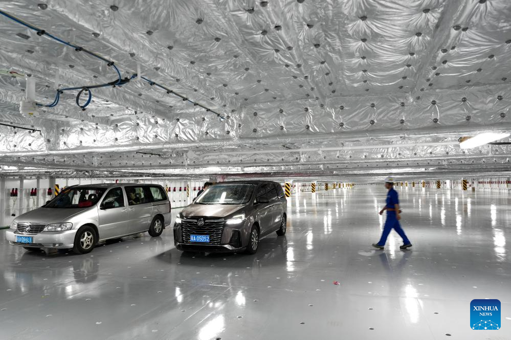 A staff member walks past the 14th story of the carpark on car carrier Glovis Leader in Guangzhou, south China's Guangdong Province, April 28, 2026. A car carrier with a maximum capacity of 10,800 car equivalent units, described as the world's largest of its kind, was delivered Tuesday in the southern Chinese city of Guangzhou.