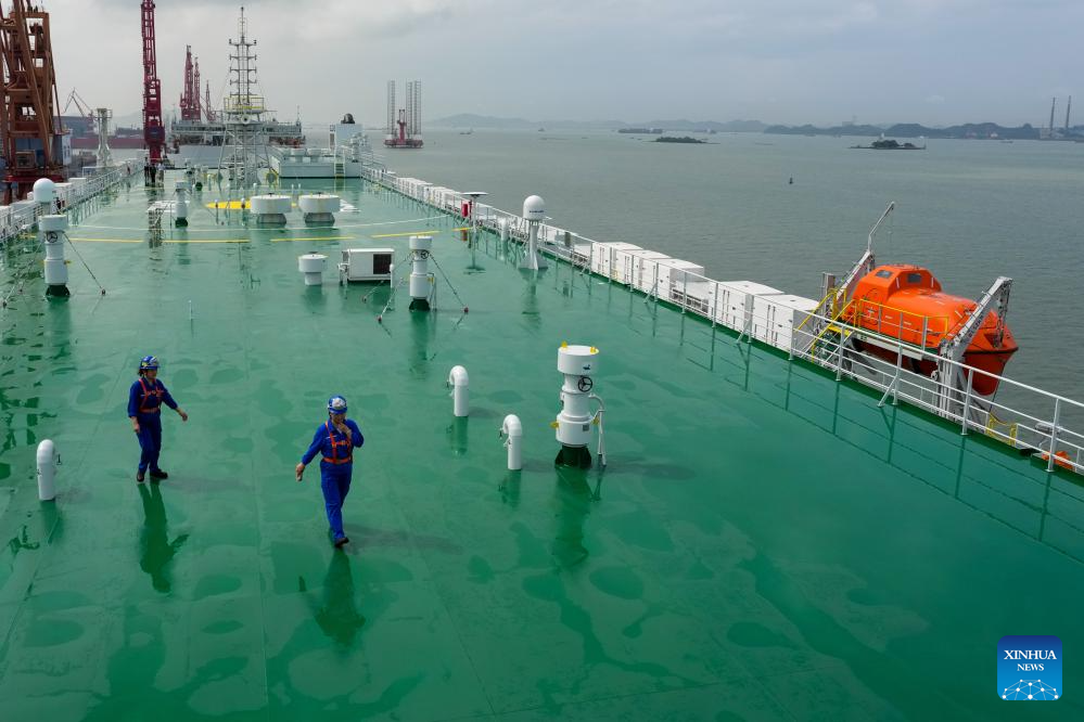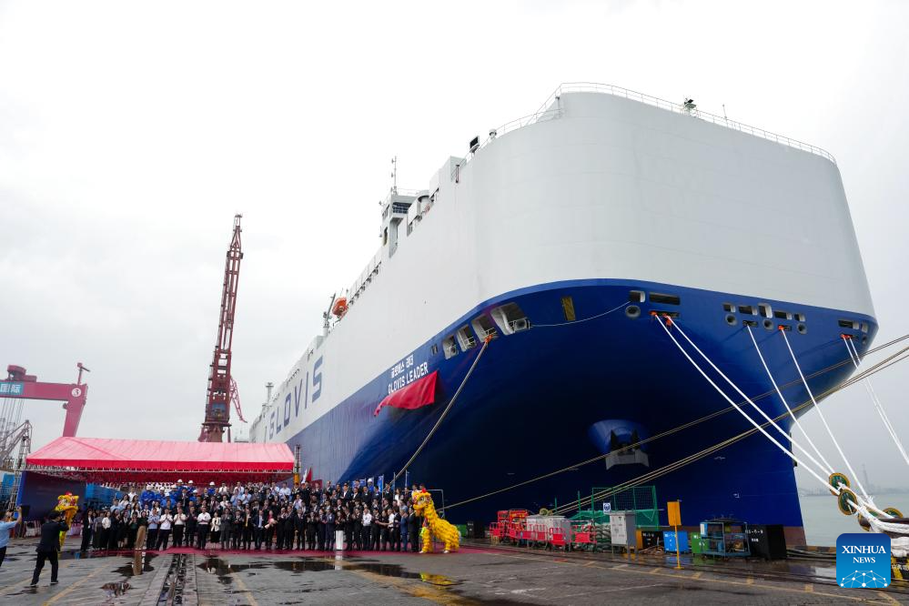 The vessel, named Glovis Leader, was built by Guangzhou Shipyard International Company Limited under the China State Shipbuilding Corporation (CSSC), together with China Shipbuilding Trading Co., Ltd. It was delivered to HMM, a leading shipping company in the Republic of Korea (ROK). After delivery, the vessel will be operated by Hyundai Glovis Co., Ltd., a logistics company also based in the ROK. (Xinhua/Wu Lu)